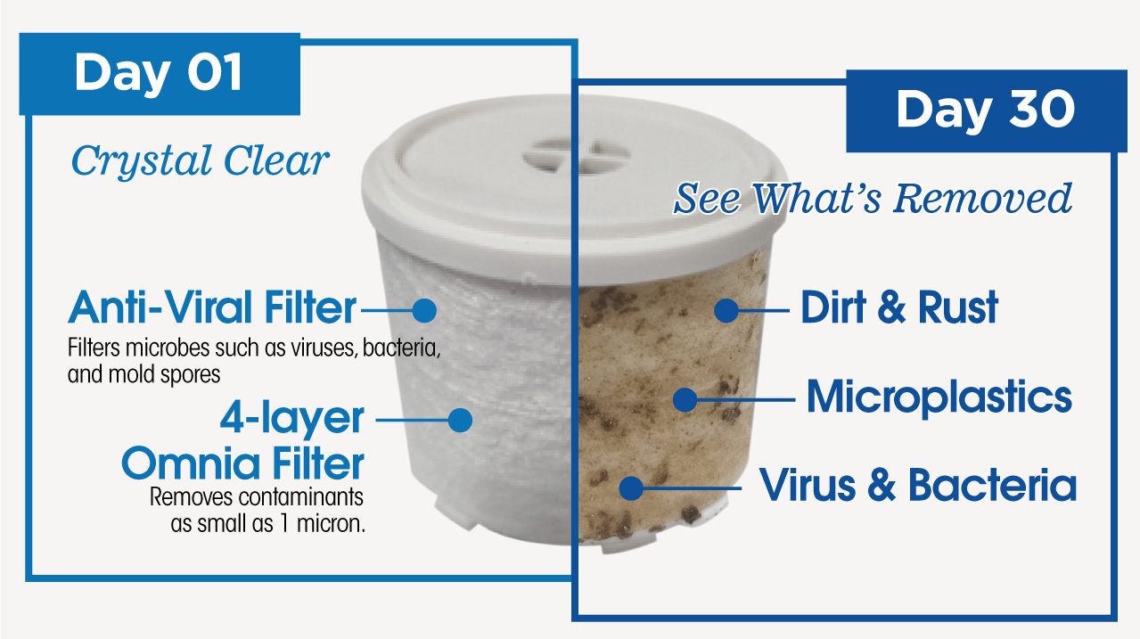 The iBlue Link Shower Filtration System uses a patented 4-layered anti-viral and anti-sediment filter to catch all contaminants as small as 1 micrometer, such as Mold, Rust, Heavy Metals, Micro Plastics, Chemicals, Bacteria, and Viruses.